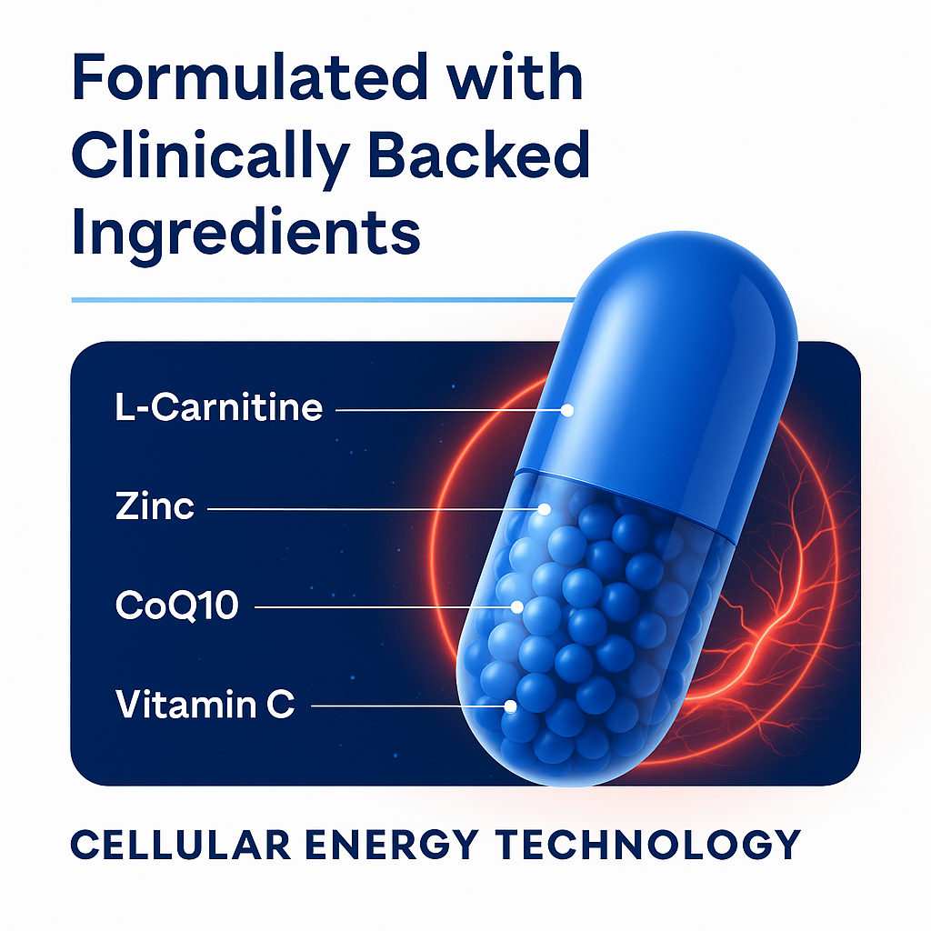 This next-generation formula supercharges cellular energy, elevates nitric oxide and circulation, and supports metabolic and hormonal balance — helping you stay sharp, strong, and energized at every age.
